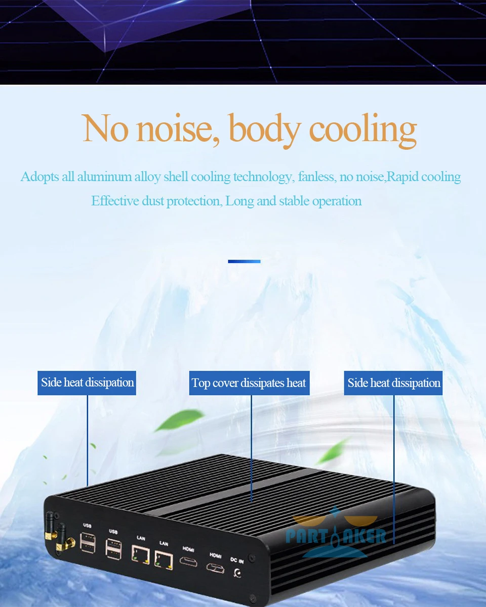 - Fanless passive cooling design:silent solution that’s ultra energy-efficient.the advanced fanless passive cooling design maximizes heat dissipation, meaning all operations can be conducted in absolute silence. business friendly features: 0 noise,low consumption,very slim