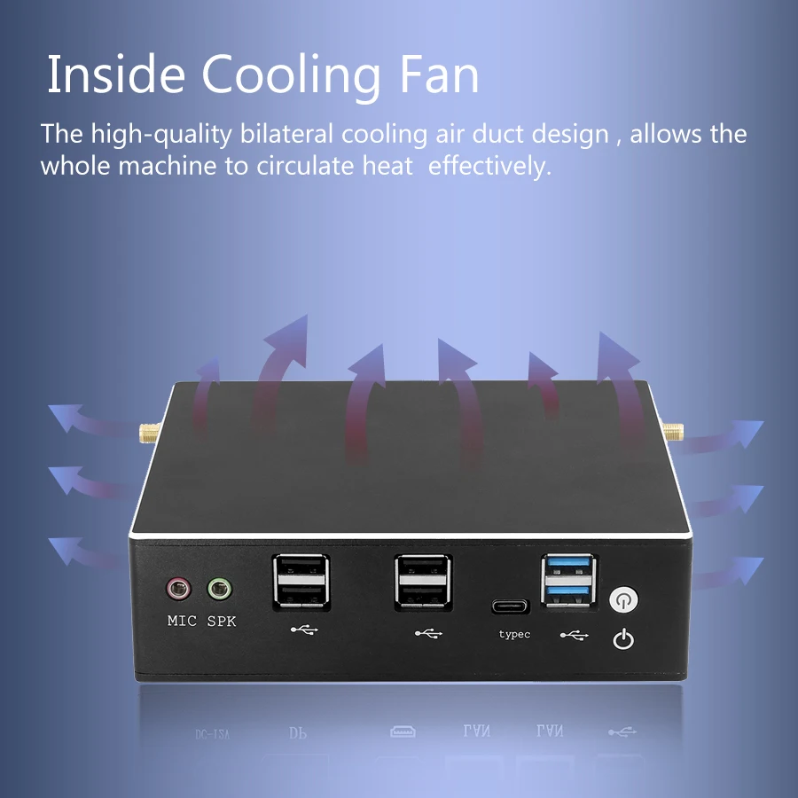 1. Compatible with 2*DDR4 2666/2400MHz memory, max to 2*16GB2. With M.2 SSD and mPCI-E Wifi pre-install, also with SD card. 3. 2* 100/1000 LAN port, NIC tyoe : I219-LM and RTL8168/8111. 4. Initiative copper mini fan on-board for heat dissipation.5. Built-in wireless Dual Band WIFI. 6. Support Network wake-up, scheduled boot, PXE boot, automatically power on function.Interface of PC: