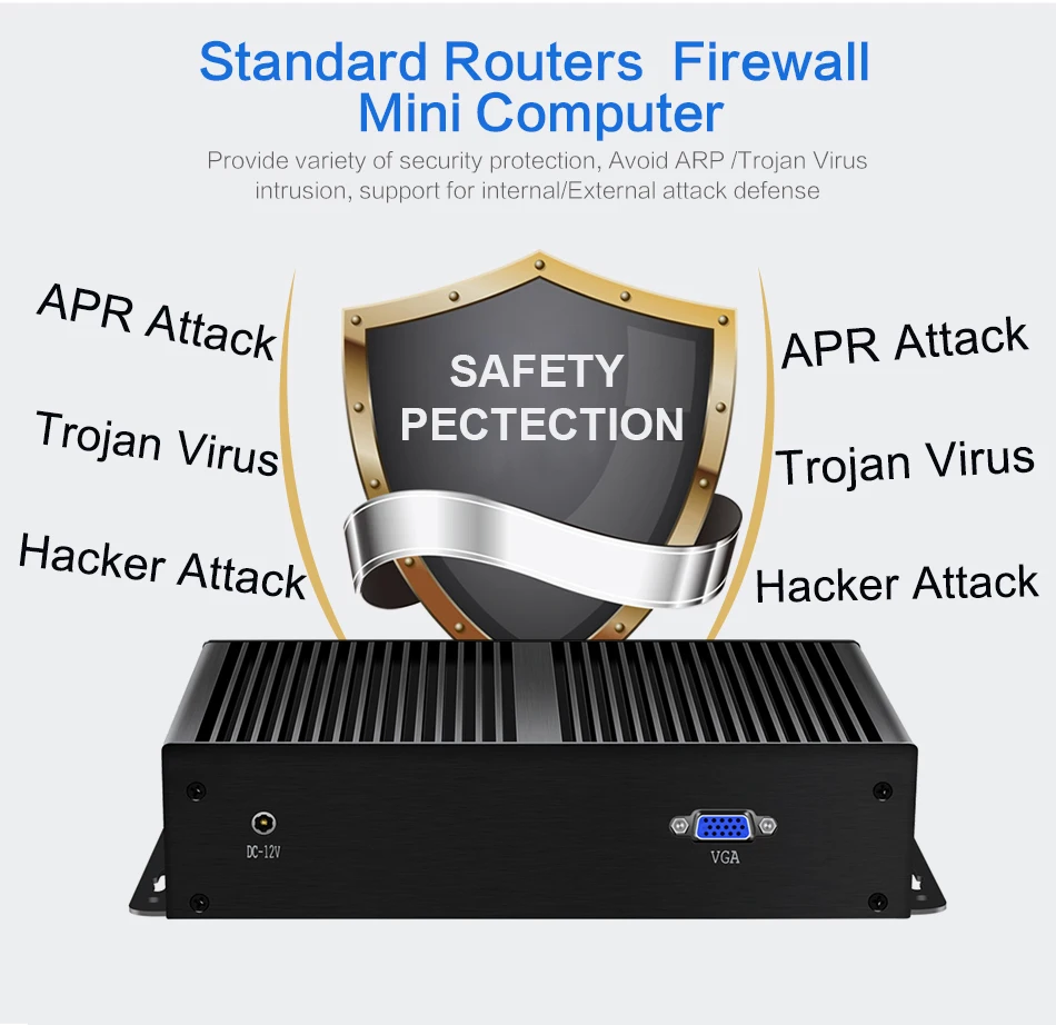 Mini PC Firewall Router Gateway Appliance Intel Celeron 1007U 1037U Processors, replaceable memory and Hard Drive, support 1*DDR3L 1.35V memory & dual storage 1*mSATA SSD and 1.*2.5inch SATA SSD/HDD, 6* Intel i211AT Gigabit LAN ports, RJ45 console, 2*USB 3.0, 1*VGA, support Windows, Linux, Pfsense, VyOS, RouterOS, Untangle/Sophos UTM