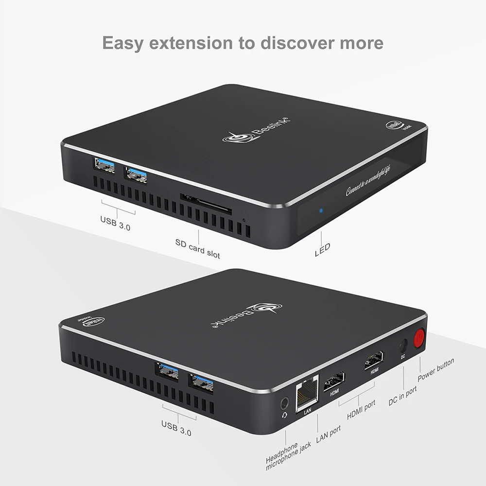 - Intel Apollo Lake Celeron Processor N3450 (2M Cache, 1.10GHz up to 2.20GHz) - Intel HD Graphics 500 - DDR 8GB + SSD 128GB/256GB/512GB (optional) - Windows 10 OS - 2.4GHz + 5GHz dual band WiFi and 1000Mbps Ethernet, fast and stable network access - Bluetooth 4.0 - 4* USB 3.0
