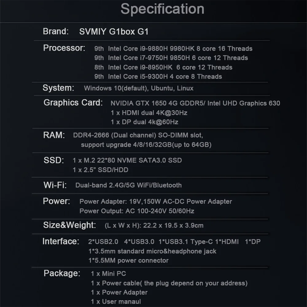| SVMIY G1Box G1 Mini pc i7 9750H i9 8950HK Windows 10 Minipc Gamer GTX 1650 32G RAM 1T NVME SSD Desktop Computer 6 Core 12 Thread |
