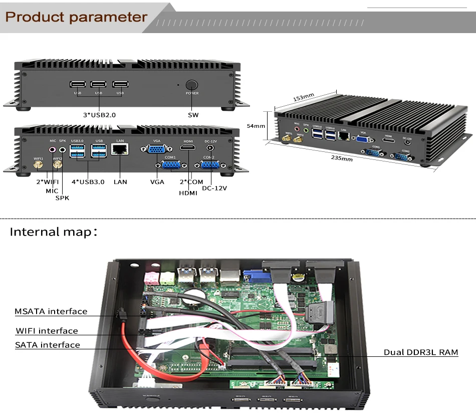 HighLight1.Dual Monitor Capable:1*VGA video port & 1*HDMIvideo port.2.Support auto start,Wake onLAN, stable operation for 24hours.3.Has a strong environmental adaptability, fully enclosed dustproof, anti-corrosion,anti-vibration.4.The PC adopts low powerconsumption, fanless zeronoise design,completelyget rid of the noise, providea Comfortable experienceenvironment.How to choose a configuration?