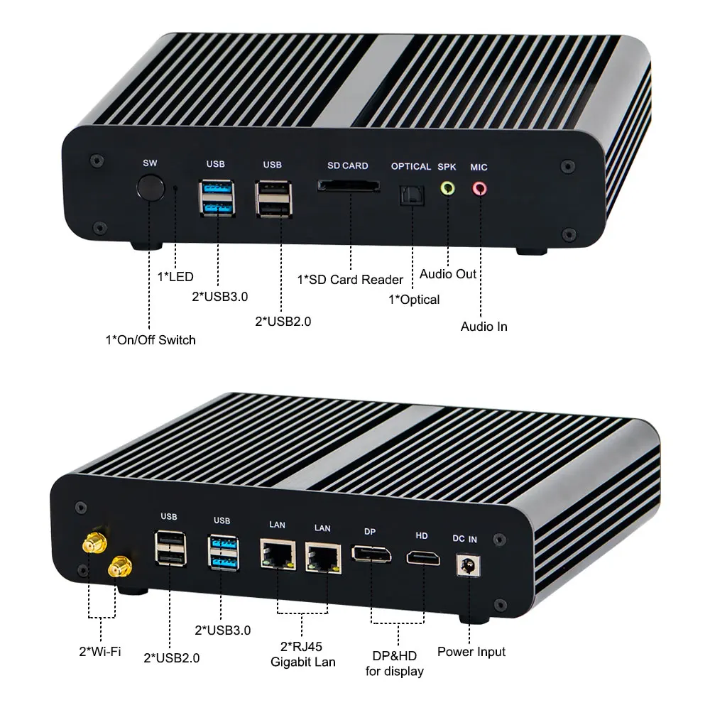 - Full aluminum black color shell, Exquisite production craft on ouside design - Fanless system without cooling fan and slim design 210*170*45MM