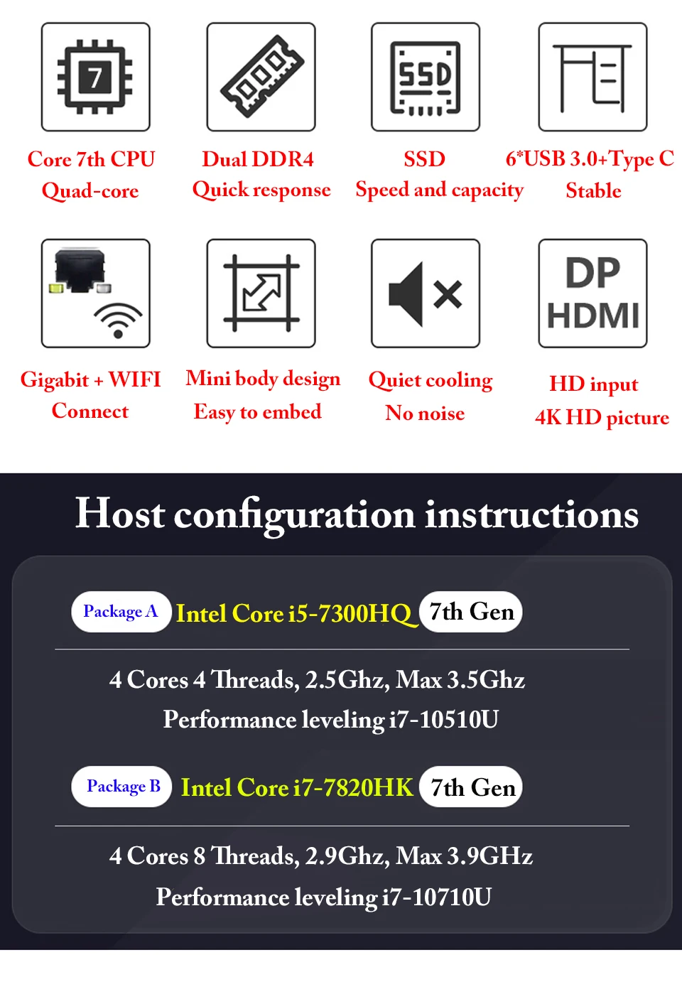 | Partaker Mini PC Intel Core i5 7300HQ i7 7820HK DDR4 Windows 10 Linux 4K Gaming UHD HTPC HDMI DP Minipc Desktop Computer |