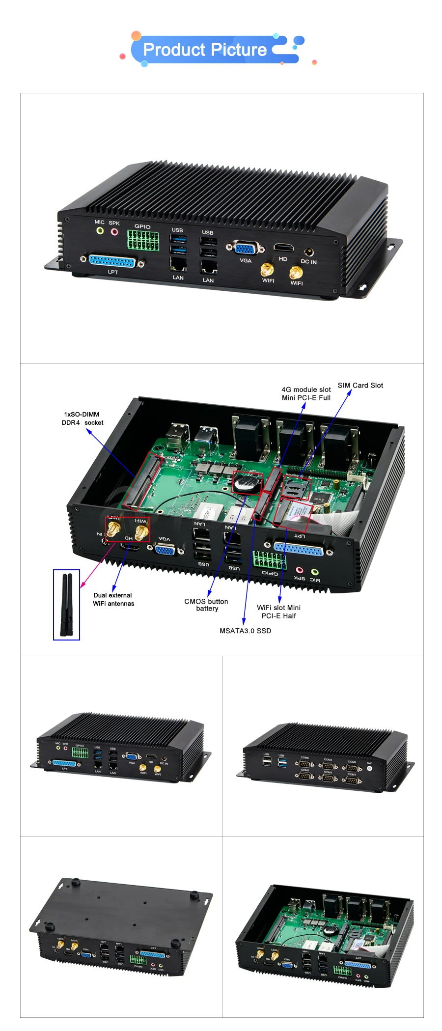 - 2xIntel i211 Gigabit RJ45 LAN and 6xCOM 232(2xCOM can change to RS422/485 from BIOS). - One embedded SIM card slot for 4G Module. - GPIO, LPT, 6COM, HDMI, VGA, USB, MIC, SPK rich ports. - Full Aluminum Alloy Black color shell, Exquisite production craft on outside design. - Fanless system without cooling fan, silent performance fit for industrial grade field, work as long as 24 hours. - Support Watchdog, Auto power on, RTC, PXE boot, Wake-on-LAN. - Low consumption TDP only 15W and can be mounted on the wall.
