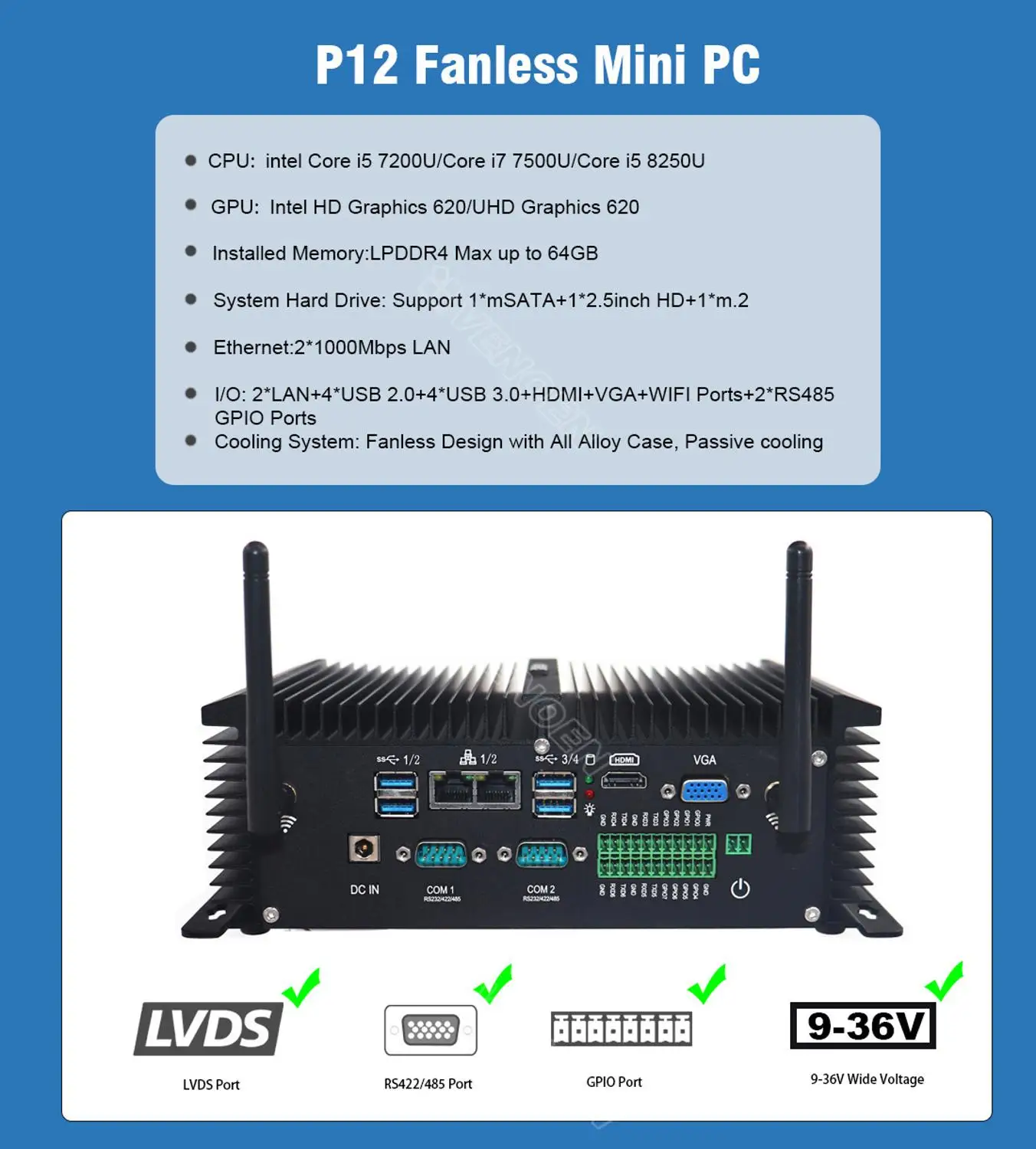 Buy Now On AliexpressMini PC Core i5 8250U 7200U i7 7500U 2*DDR4 RAM 2*RS485 Dual LAN HDMI WiFi 4G Module Windows Linux Fanless Industrial Computer